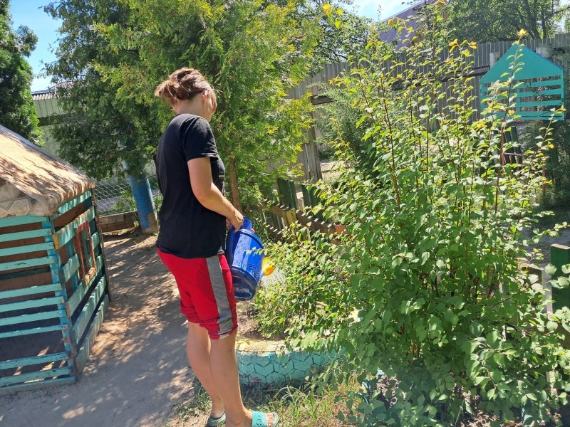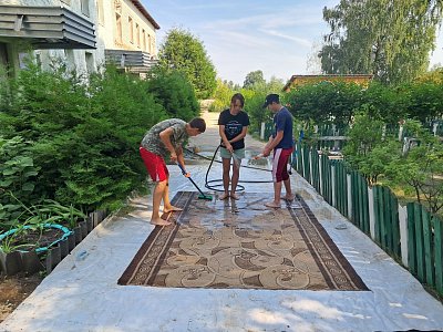 Этим летом у нас трудятся Даниил, Соня и Арина. Ребята выполняют разную работу - от полива растений до стирки ковров.